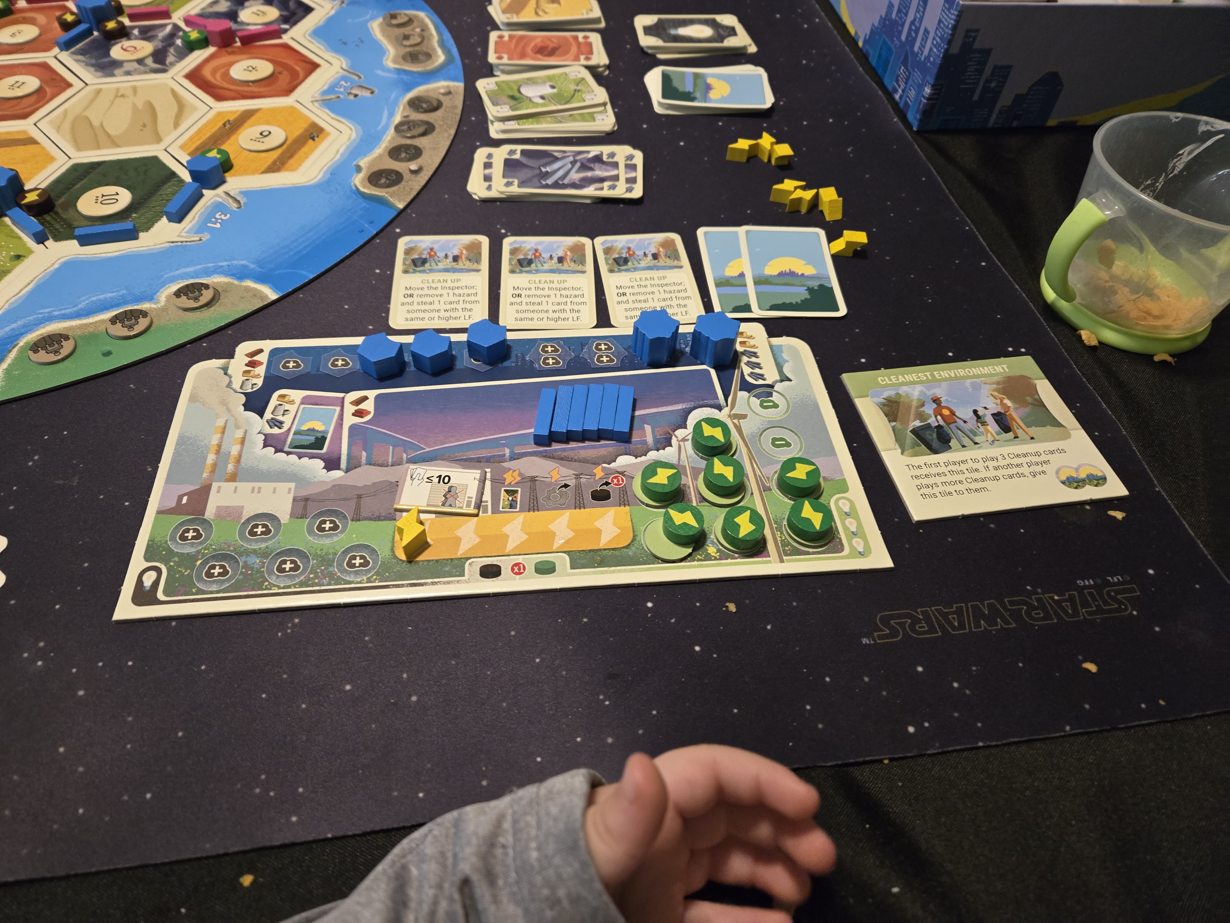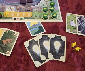 Building fossil fuel power plants early is actually fairly low risk, and can be high reward. They are cheap, and can grant the player easy access to valuable electricity tokens. These can provide a sizeable head start compared to players who try to save up to go renewable right from the start. However, the game's environmental events strongly discourage any player from having the most fossil fuel plants, as many environmental event effects explicitly punish the most polluting player. Yeah, you may get extra electricity tokens early on, but you may also end up spending all of them to clean up pollution that your dirty power plants caused, or to exchange those electricity tokens for cards that events either took away or prevented you from collecting.